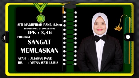 SITI MAGHFIRAH PANE, S.Kep LHOKSEUMAWE, 01 JANUARI 1998 IPK : 3,36 PREDIKAT SANGAT MEMUASKAN AYAH : ALIASAN PANE IBU : YETNA WATI LUBIS