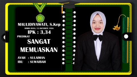 MAULIDIYAWATI, S.Kep RIMBA RAYA, 13 OKTOBER 1998 IPK : 3,34 PREDIKAT SANGAT MEMUASKAN AYAH : SULAIMAN IBU : SUWAIBAH