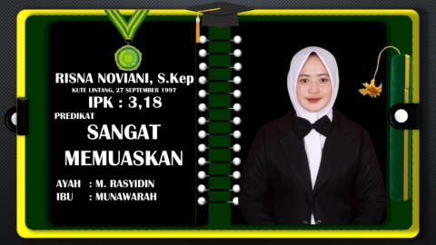 RISNA NOVIANI, S.Kep KUTE LINTANG, 27 SEPTEMBER 1997 IPK : 3,18 PREDIKAT SANGAT MEMUASKAN AYAH : M. RASYIDIN IBU : MUNAWARAH