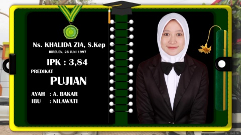 Ns. KHALIDA ZIA, S.Kep BIREUEN, 26 JUNI 1997 IPK : 3,84 PREDIKAT PUJIAN AYAH : A. BAKAR IBU : NILAWATI
