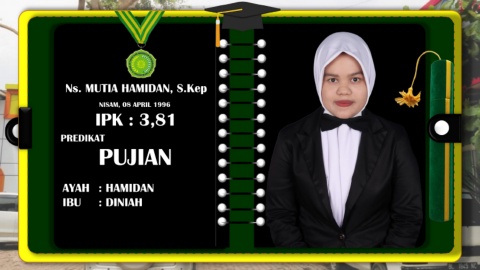 Ns. MUTIA HAMIDAN, S.Kep NISAM, 08 APRIL 1996 IPK : 3,81 PREDIKAT PUJIAN AYAH : HAMIDAN IBU : DINIAH