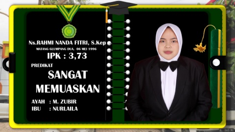 Ns.RAHMI NANDA FITRI, S.Kep MATANG GLUMPANG DUA, 06 MEI 1996 IPK : 3,73 PREDIKAT SANGAT MEMUASKAN AYAH : M. ZUBIR IBU : NURLAILA