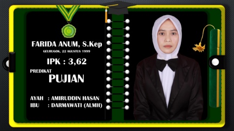 FARIDA ANUM, S.Kep GEURUGOK, 22 AGUSTUS 1999 IPK : 3,62 PREDIKAT PUJIAN AYAH : AMIRUDDIN HASAN IBU : DARMAWATI (ALMH)