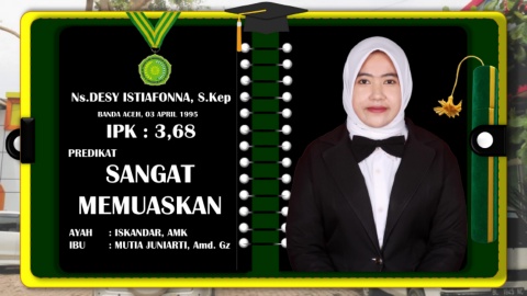 Ns.DESY ISTIAFONNA, S.Kep BANDA ACEH, 03 APRIL 1995 IPK : 3,68 PREDIKAT SANGAT MEMUASKAN AYAH : ISKANDAR, AMK IBU : MUTIA JUNIARTI, Amd. Gz