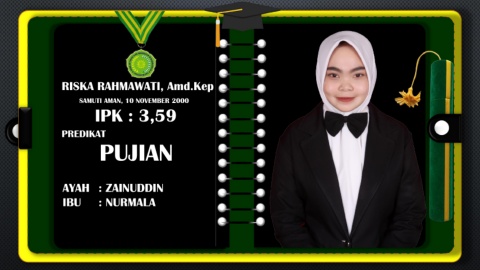 RISKA RAHMAWATI, Amd.Kep SAMUTI AMAN, 10 NOVEMBER 2000 IPK : 3,59 PREDIKAT PUJIAN AYAH : ZAINUDDIN IBU : NURMALA