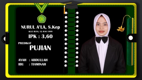NURUL A’LA, S.Kep ALUE BUYA, 12 JUNI 1999 IPK : 3,60 PREDIKAT PUJIAN AYAH : ABDULLAH IBU : TIAMINAH