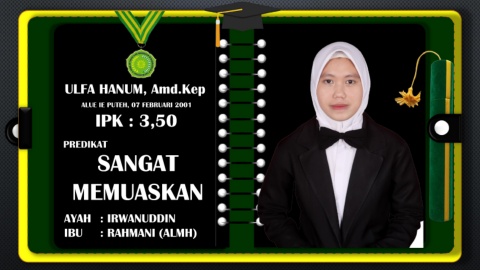 ULFA HANUM, Amd.Kep ALUE IE PUTEH, 07 FEBRUARI 2001 IPK : 3,50 PREDIKAT SANGAT MEMUASKAN AYAH : IRWANUDDIN IBU : RAHMANI (ALMH)