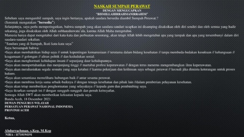 Selanjutnya, saya perlu memperingatkan, bahwa sumpah yang akan saudara-saudari ucapkan ini disamping disaksikan oleh diri sendiri dan oleh semua yang hadir