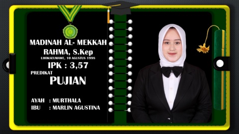 MADINAH AL- MEKKAH RAHMA, S.Kep LHOKSEUMAWE, 10 AGUSTUS 1998 IPK : 3,57 PREDIKAT PUJIAN AYAH : MURTHALA IBU : MARLIN AGUSTINA
