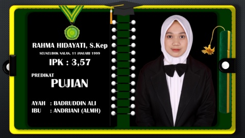RAHMA HIDAYATI, S.Kep SEUNEUBOK NALAN, 11 JANUARI 1999 IPK : 3,57 PREDIKAT PUJIAN AYAH : BADRUDDIN ALI IBU : ANDRIANI (ALMH)