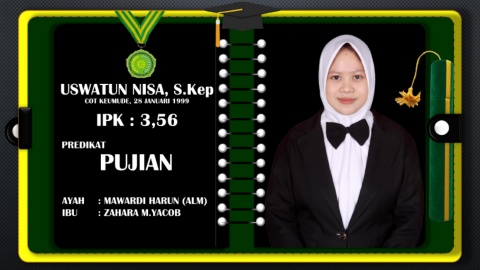 USWATUN NISA, S.Kep COT KEUMUDE, 28 JANUARI 1999 IPK : 3,56 PREDIKAT PUJIAN AYAH : MAWARDI HARUN (ALM) IBU : ZAHARA M.YACOB