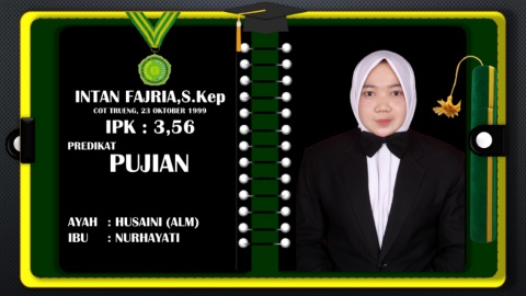 INTAN FAJRIA,S.Kep COT TRUENG, 23 OKTOBER 1999 IPK : 3,56 PREDIKAT PUJIAN AYAH : HUSAINI (ALM) IBU : NURHAYATI