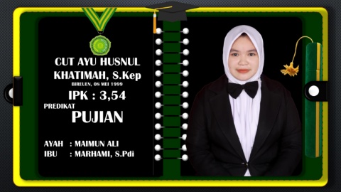 CUT AYU HUSNUL KHATIMAH, S.Kep BIREUEN, 08 MEI 1999 IPK : 3,54 PREDIKAT PUJIAN AYAH : MAIMUN ALI IBU : MARHAMI, S.Pdi