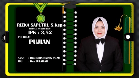 RIZKA SAPUTRI, S.Kep BIREUEN, 16 JULI 2000 IPK : 3,52 PREDIKAT PUJIAN AYAH : Drs.IDRIS RADEN (ALM) IBU : Dra.ZULAIFAH