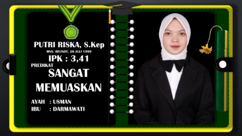 PUTRI RISKA, S.Kep MNS. BEUNOT, 20 JULI 1999 IPK : 3,41 PREDIKAT SANGAT MEMUASKAN AYAH : USMAN IBU : DARMAWATI