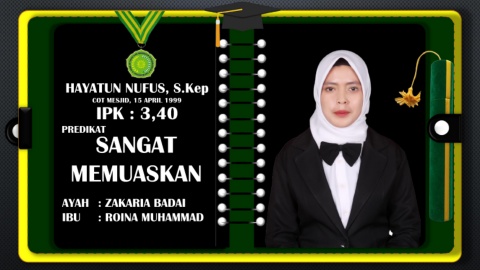 HAYATUN NUFUS, S.Kep COT MESJID, 15 APRIL 1999 IPK : 3,40 PREDIKAT SANGAT MEMUASKAN AYAH : ZAKARIA BADAI IBU : ROINA MUHAMMAD