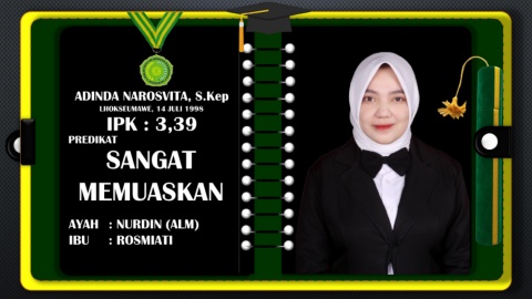 ADINDA NAROSVITA, S.Kep LHOKSEUMAWE, 14 JULI 1998 IPK : 3,39 PREDIKAT SANGAT MEMUASKAN AYAH : NURDIN (ALM) IBU : ROSMIATI