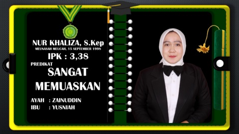 NUR KHALIZA, S.Kep MEUNASAH MEUCAH, 15 SEPTEMBER 1998 IPK : 3,38 PREDIKAT SANGAT MEMUASKAN AYAH : ZAINUDDIN IBU : YUSNIAH