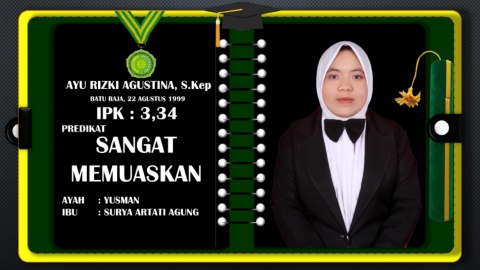 AYU RIZKI AGUSTINA, S.Kep BATU RAJA, 22 AGUSTUS 1999 IPK : 3,34 PREDIKAT SANGAT MEMUASKAN AYAH : YUSMAN IBU : SURYA ARTATI AGUNG