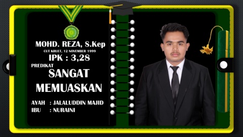 MOHD. REZA, S.Kep CUT KRUET, 12 NOVEMBER 1999 IPK : 3,28 PREDIKAT SANGAT MEMUASKAN AYAH : JALALUDDIN MAJID IBU : NURAINI