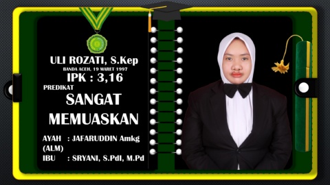 ULI ROZATI, S.Kep BANDA ACEH, 19 MARET 1997 IPK : 3,16 PREDIKAT SANGAT MEMUASKAN AYAH : JAFARUDDIN Amkg (ALM) IBU : SRYANI, S.PdI, M.Pd