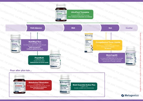 Suggestion de protocole. La prise d%u2019un compl%u00e9ment alimentaire ne se substitue pas %u00e0 un avis m%u00e9dical. Petit-d%u00e9jeunerMidiSoirCoucherMetaActive%u00ae R%u00e9solution1 %u00e0 4 g%u00e9lule(s) / jourAu cours d%u2019un repas avec un peu de grasPour favoriser la r%u00e9solution de l%u2019inflammationMulti Essentiel Active Plus1 g%u00e9lule / jourSoutien complet de la mitochondrieUltraFlora%u00ae Complete1 g%u00e9lule / jourN%u2019importe quand dans la journ%u00e9ePour restaurer la diversit%u00e9 microbiennePhytoMulti1 comprim%u00e9 / jourSoutien antioxydant Vieillissement en bonne sant%u00e9MetaCognifit1 g%u00e9lule / jour le soirAu cours d%u2019un repas avec un peu de grasPerformances cognitives et mentales, concentration et acuit%u00e9, m%u00e9moirePour aller plus loin...NutriMag%u00ae Duo1 %u00e0 2 mesurette(s) / jourAu cours d%u2019un repas avec un peu de grasEn cure ou au quotidienEffet myorelaxant, meilleure gestion du stressOmegaGenics%u00ae Forte Liquide1 c. %u00e0 c. / jourAu cours d%u2019un repas avec un peu de grasEn cure ou au quotidienSi carence