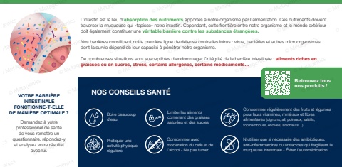 L%u2019intestin est le lieu d%u2019absorption des nutriments apport%u00e9s %u00e0 notre organisme par l%u2019alimentation. Ces nutriments doivent traverser la muqueuse qui %u00abtapisse%u00bb notre intestin. Cependant, cette fronti%u00e8re entre notre organisme et le monde ext%u00e9rieur doit %u00e9galement constituer une v%u00e9ritable barri%u00e8re contre les substances %u00e9trang%u00e8res.Nos barri%u00e8res constituent notre premi%u00e8re ligne de d%u00e9fense contre les intrus : virus, bact%u00e9ries et autres microorganismes dont la survie d%u00e9pend de leur capacit%u00e9 %u00e0 p%u00e9n%u00e9trer notre organisme.De nombreuses situations sont susceptibles d%u2019endommager l%u2019int%u00e9grit%u00e9 de la barri%u00e8re intestinale : aliments riches en graisses ou en sucres, stress, certains allerg%u00e8nes, certains m%u00e9dicaments%u2026NOS CONSEILS SANT%u00c9VOTRE BARRI%u00c8RE INTESTINALE FONCTIONNE-T-ELLE DE MANI%u00c8RE OPTIMALE ?Demandez %u00e0 votre professionnel de sant%u00e9 de vous remettre un questionnaire, r%u00e9pondez-y et analysez votre r%u00e9sultat avec lui.Limiter les aliments contenant des graisses satur%u00e9es et des sucresConsommer avec mod%u00e9ration du caf%u00e9 et de l%u2019alcool - Ne pas fumerBoire beaucoup d%u2019eauPratiquer une activit%u00e9 physique r%u00e9guli%u00e8reConsommer r%u00e9guli%u00e8rement des fruits et l%u00e9gumes pour leurs vitamines, min%u00e9raux et fibres alimentaires (oignons, ail, poireaux, salsifis, topinambours, endives, artichauts%u2026)N%u2019utiliser que si n%u00e9cessaire des antibiotiques, anti-inflammatoires ou antiacides qui fragilisent la muqueuse intestinale - %u00c9viter l%u2019autom%u00e9dicationRetrouvez tousnos produits !etagenics %u00a9 Metagenics %u00a9 Metagenics %u00a9 MetagenicsMetagenics %u00a9 Metagenics %u00a9 MetagenMetagenics %u00a9 MetaM