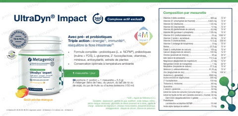 1 mesurette / jour56 portions (1 portion = 1 mesurette = 5,5 g)%u00c0 m%u00e9langer dans de l%u2019eau, du yaourt, du lait (de riz ou de soja), du jus de fruits ou d%u2019autres boissons (150 ml)UltraDyn%u00ae ImpactAvec pr%u00e9- et probiotiquesTriple action : %u00e9nergie(1), immunit%u00e9(2), r%u00e9%u00e9quilibre la flore intestinale(3)%u2022Formule compl%u00e8te : probiotiques (L. a. NCFM%u00ae), pr%u00e9biotiques (inuline + FOS), L-glutamine, 2%u2019-fucosyllactose, vitamines, min%u00e9raux, antioxydants, extraits de plantes%u2022Conservation optimale %u00e0 temp%u00e9rature ambiante(1) Vitamines B1, B2, B3, B5, B6, B12, magn%u00e9sium, calcium - (2) Vitamines A, C, D, s%u00e9l%u00e9nium, zinc - (3) Vitamine A360Complexe actif exclusif%u00b0Go%u00fbt p%u00eache-mangueINGR%u00c9DIENTSCLINIQUEMENTTEST%u00c9SComposition par mesuretteVitamine A (b%u00eata-carot%u00e8ne).............................................600 %u00b5g75 %*Vitamine B1 (chlorhydrate de thiamine).......................0,825 mg75 %*Vitamine B2 (riboflavine)1,05 mg75 %*Vitamine B3 (niacinamide)...............................................12 mg75 %*Vitamine B5 (pantoth%u00e9nate de calcium)............................4,5 mg75 %*Vitamine B6 (pyridoxal-5-phosphate)1,05 mg75 %*Vitamine B12 (m%u00e9thylcobalamine).....................................25 %u00b5g1000 %*Vitamine C (acide L-ascorbique).......................................60 mg75 %*Vitamine D (chol%u00e9calcif%u00e9rol)12,5 %u00b5g250 %*Vitamine E (m%u00e9lange de tocoph%u00e9rols)..................................9 mg75 %*Biotine..........................................................................37,5 %u00b5g75 %*Folate (L-m%u00e9thylfolate de calcium)...................................150 %u00b5g75 %*Calcium (bisglycinate de calcium)...................................120 mg15 %*Chrome (picolinate de chrome).........................................30 %u00b5g30 %*Iode (iodure de potassium)...........................................112,5 %u00b5g75 %*Magn%u00e9sium (bisglycinate de magn%u00e9sium)57 mg15 %*Mangan%u00e8se (citrate de mangan%u00e8se)....................................1 mg50 %*Molybd%u00e8ne (molybdate de sodium).................................37,5 %u00b5g75 %*S%u00e9l%u00e9nium (L-s%u00e9l%u00e9nom%u00e9thionine)41,25 %u00b5g75 %*Zinc (bisglycinate de zinc)................................................10 mg100 %*Glutamine (L-glutamine)..............................................2000 mgInuline enrichie en oligofructose500 mg2%u2019-fucosyllactose...........................................................150 mgThr%u00e9onine (L-thr%u00e9onine)...................................................60 mgQuerc%u00e9tine......................................................................50 mgL-alanyl-L-glutamine50 mgExtrait de racine de curcuma (Curcuma longa L.)..............30 mgExtrait de feuille de th%u00e9 vert (Camellia sinensis (L.) Kuntze)30 mg Dont EGCG (%u00e9pigallocat%u00e9chine-3-gallate)5 mgProbiotiquesLactobacillus acidophilus NCFM%u00ae................................10 mldAcide alpha-lipo%u00efque de sodium75 mg*%AR = Apport de R%u00e9f%u00e9rence (C.E.)Excipients : %u00e9paississant : gomme de guar, acidifiant : acide malique, ar%u00f4me : p%u00eache-mangue, %u00e9dulcorant : glycosides de st%u00e9viol provenant de la st%u00e9via, agents de charge : carbonate de magn%u00e9sium, cellulose microcristalline, phosphate dicalcique, antiagglom%u00e9rant : dioxyde de silicium, chlorure de potassium.etagenics %u00a9 Metagenics %u00a9 Metagenics %u00a9 MetagenicsMetagenics %u00a9 Metagenics %u00a9 MetagenMetagenics %u00a9 MetaM