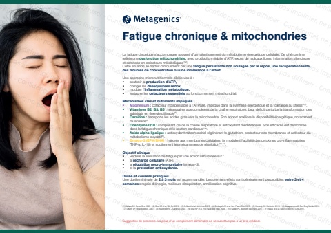 La fatigue chronique s%u2019accompagne souvent d%u2019un ralentissement du m%u00e9tabolisme %u00e9nerg%u00e9tique cellulaire. Ce ph%u00e9nom%u00e8ne refl%u00e8te une dysfonction mitochondriale, avec production r%u00e9duite d%u2019ATP, exc%u00e8s de radicaux libres, inflammation silencieuse et carences en cofacteurs m%u00e9taboliques(1,2)Cette situation se traduit cliniquement par une fatigue persistante non soulag%u00e9e par le repos, une r%u00e9cup%u00e9ration lente, des troubles de concentration ou une intol%u00e9rance %u00e0 l%u2019effort.Une approche micronutritionnelle cibl%u00e9e vise %u00e0 :%u2022soutenir la production d%u2019ATP,%u2022corriger les d%u00e9s%u00e9quilibres redox,%u2022moduler l%u2019inflammation m%u00e9tabolique,%u2022restaurer les cofacteurs essentiels au fonctionnement mitochondrial.M%u00e9canismes cl%u00e9s et nutriments impliqu%u00e9s%u2022Magn%u00e9sium : cofacteur indispensable %u00e0 l%u2019ATPase, impliqu%u00e9 dans la synth%u00e8se %u00e9nerg%u00e9tique et la tol%u00e9rance au stress(3,4)%u2022Vitamines B2, B3, B5 : n%u00e9cessaires aux complexes de la cha%u00eene respiratoire. Leur d%u00e9ficit perturbe la transformation des substrats en %u00e9nergie utilisable(5).%u2022Carnitine : transporte les acides gras vers la mitochondrie. Son apport am%u00e9liore la disponibilit%u00e9 %u00e9nerg%u00e9tique, notamment musculaire(6).%u2022Coenzyme Q10 : composant cl%u00e9 de la cha%u00eene respiratoire et antioxydant membranaire. Son efficacit%u00e9 est d%u00e9montr%u00e9e dans la fatigue chronique et le soutien cardiaque(7,8).%u2022Acide alpha-lipo%u00efque : antioxydant mitochondrial r%u00e9g%u00e9n%u00e9rant le glutathion, protecteur des membranes et activateur du m%u00e9tabolisme oxydatif(9)%u2022Om%u00e9ga-3 (EPA/DHA) : int%u00e9gr%u00e9s aux membranes cellulaires, ils modulent l%u2019activit%u00e9 des cytokines pro-inflammatoires (TNF-%u03b1, IL-1%u03b2) et soutiennent les m%u00e9canismes de r%u00e9solution(10,11)Objectif clinique%u2022R%u00e9duire la sensation de fatigue par une action simultan%u00e9e sur :%u2022la recharge cellulaire (ATP),%u2022la r%u00e9gulation neuro-immunitaire (om%u00e9ga-3),%u2022et la protection antioxydante.Dur%u00e9e et conseils pratiquesUne dur%u00e9e minimale de 2 %u00e0 3 mois est recommand%u00e9e. Les premiers effets sont g%u00e9n%u00e9ralement perceptibles entre 3 et 4 semaines : regain d%u2019%u00e9nergie, meilleure r%u00e9cup%u00e9ration, am%u00e9lioration cognitive.(1) Wallace DC. Genes Dev. 2005. - (2) Bess AS et al. Clin Sci. 2012. - (3) Gr%u00f6ber U et al. Nutrients. 2015. - (4) Barbagallo M et al. Curr Pharm Des. 2010. - (5) Kennedy DO. Nutrients. 2016. - (6) Malaguarnera M. Curr Drug Metab. 2012.- (7) Littarru GP. Mitochondrion. 2007. - (8) Rosenfeldt FL. J Card Fail. 2007. - (9) Shay KP et al. Free Radic Biol Med. 2009. - (10) Calder PC. Biochem Soc Trans. 2017. - (11) Maes M et al. Neuro Endocrinol Lett. 2011.Suggestion de protocole. La prise d%u2019un compl%u00e9ment alimentaire ne se substitue pas %u00e0 un avis m%u00e9dical. Fatigue chronique & mitochondries