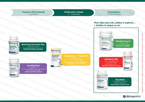 Suggestion de protocole. La prise d%u2019un compl%u00e9ment alimentaire ne se substitue pas %u00e0 un avis m%u00e9dical. UltraDyn%u00ae Impact1 mesurette / jourEn cure ou au quotidienSi inconfort intestinalPhytoMulti1 comprim%u00e9 / jour le matinSoutien antioxydant Vieillissement en bonne sant%u00e9MetaDetox 3601/2 %u00e0 1 mesurette(s) / jour dans 300ml d%u2019eauPour soutenir le foie et d%u00e9toxifier les toxines en exc%u00e8sMulti Essentiel Active Plus1 g%u00e9lule / jour le matinSoutien complet de la mitochondrieCombattre la fatigue chroniqueOmegaGenics%u00ae Capital Plus1 g%u00e9lule / jour le soirAu cours d%u2019un repas avec un peu de grasEn cure ou au quotidienR%u00e9duire l%u2019inflammation et prot%u00e9ger les membranes mitochondrialesPour aller plus loin, pistes %u00e0 explorer...+ V%u00e9rifier le statut en ferPremiers effets ressentis1 semainesAm%u00e9lioration clinique3 - 4 semainesConsolidation3 mois minimumNutriMag%u00ae Duo1 mesurette / jourAu cours d%u2019un repas avec un peu de grasEn cure ou au quotidienMeilleure gestion du stress