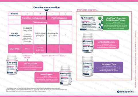Suggestion de protocole. La prise d%u2019un compl%u00e9ment alimentaire ne se substitue pas %u00e0 un avis m%u00e9dical. Pour aller plus loin...NutriMag%u00ae Duo1 %u00e0 2 mesurette(s) / jourAu cours d%u2019un repas avec un peu de grasEn cure ou au quotidienMeilleure gestion du stressUltraFlora%u00ae CompleteProbiotiques Femme1 g%u00e9lule / jour%u00c0 n%u2019importe quel moment de la journ%u00e9e, au quotidien et pour renforcer la flore intestinale et vaginale fragilis%u00e9e par la chute d%u2019oestrog%u00e8nesUriConfort Femme1 %u00e0 4 g%u00e9lule(s) / jourEn cas de cystites r%u00e9cidivantesCf. protocole correspondantPhases-2-112Transition m%u00e9nopausiquePostm%u00e9nopauseP%u00e9rim%u00e9nopauseCycles menstruelsIrr%u00e9gularit%u00e9 des cycles(7 jours de diff%u00e9rences ou plus dans la dur%u00e9e des cycles cons%u00e9cutifs)Am%u00e9norrh%u00e9e %u2265 60 joursAm%u00e9norrh%u00e9e %u2265 12 mois/Endocrine FSH FSH (%u2265 25 IU/I)Derni%u00e8re menstruationMenoConfort1 %u00e0 2 comprim%u00e9(s) / jourPour soutenir la transition hormonale vers la m%u00e9nopause**MenoSupport1 g%u00e9lule / jourPour soulager les inconforts de la m%u00e9nopause (ex. bouff%u00e9es de chaleur) et favoriser l%u2019%u00e9quilibre %u00e9motionnel**Isoflavones de sojaHop%u00e9ine & Isoflavones de soja*D%u00e9conseill%u00e9 chez les femmes ayant des ant%u00e9c%u00e9dents personnels ou familiaux de cancer du sein.**D%u00e9conseill%u00e9 en cas d%u2019ant%u00e9c%u00e9dent personnel ou familial de cancer du sein ou de cancer hormonod%u00e9pendant.D%u00e9conseill%u00e9 aux femmes enceintes ou allaitantes. R%u00e9serv%u00e9 aux adultes.