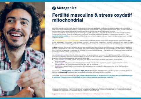 La fertilit%u00e9 masculine est en d%u00e9clin depuis plusieurs d%u00e9cennies, avec une baisse significative de la concentration, de la mobilit%u00e9 et de la morphologie des spermatozo%u00efdes(1). Cette alt%u00e9ration est multifactorielle : perturbateurs endocriniens, stress oxydatif, carences nutritionnelles, inflammation silencieuse et dysfonction mitochondriale sont autant de facteurs reconnus(2,3).Le stress oxydatif est une cause majeure de dommages %u00e0 l%u2019ADN spermatique, de perte de mobilit%u00e9 et de d%u00e9fauts de f%u00e9condation. Or, les spermatozo%u00efdes, riches en acides gras polyinsatur%u00e9s, sont particuli%u00e8rement sensibles %u00e0 la peroxydation lipidique(4). Une suppl%u00e9mentation cibl%u00e9e est donc recommand%u00e9e d%u00e8s la mise en projet de paternit%u00e9, pour soutenir la spermatogen%u00e8se et prot%u00e9ger l%u2019int%u00e9grit%u00e9 cellulaire.Les om%u00e9ga-3 %u00e0 longue cha%u00eene (EPA/DHA) interviennent directement dans la composition des membranes spermatiques et leur fluidit%u00e9, essentielle %u00e0 la mobilit%u00e9 et %u00e0 la fusion avec l%u2019ovocyte(5). Ils contribuent %u00e9galement %u00e0 moduler l%u2019inflammation et le stress oxydatif. Des apports de 500 %u00e0 1 000 mg/j de DHA ont montr%u00e9 des effets b%u00e9n%u00e9fiques sur la concentration et la vitalit%u00e9 des spermatozo%u00efdes(6).Le zinc, cofacteur d%u2019enzymes impliqu%u00e9es dans la spermatogen%u00e8se et la synth%u00e8se de testost%u00e9rone, est indispensable %u00e0 la qualit%u00e9 du sperme. Il poss%u00e8de aussi une action antioxydante, anti-inflammatoire et stabilisante de l%u2019ADN spermatique. Une carence, fr%u00e9quente chez l%u2019homme, est associ%u00e9e %u00e0 une baisse de la motilit%u00e9 et du volume spermatique(7,8). Des apports de 15 %u00e0 30 mg/j sous forme bien absorb%u00e9e (picolinate, citrate) sont %u00e0 privil%u00e9gier.Les mitochondries, situ%u00e9es dans la pi%u00e8ce interm%u00e9diaire du spermatozo%u00efde, fournissent l%u2019%u00e9nergie n%u00e9cessaire %u00e0 la motilit%u00e9 via la production d%u2019ATP. Leur dysfonction est associ%u00e9e %u00e0 une diminution de la mobilit%u00e9 et %u00e0 une fragmentation de l%u2019ADN(9). Le soutien de la biog%u00e9n%u00e8se mitochondriale passe par des nutriments tels que :%u2022La L-carnitine, qui facilite l%u2019entr%u00e9e des acides gras dans la mitochondrie, am%u00e9liore la mobilit%u00e9 et la densit%u00e9 des spermatozo%u00efdes(10).%u2022Le Coenzyme Q10, antioxydant mitochondrial et cofacteur de la cha%u00eene respiratoire, dont la suppl%u00e9mentation am%u00e9liore significativement les param%u00e8tres spermatiques et le taux de grossesse(11).%u2022Le s%u00e9l%u00e9nium, qui prot%u00e8ge les mitochondries de la peroxydation et participe %u00e0 la spermatogen%u00e8se via les s%u00e9l%u00e9noprot%u00e9ines testiculaires(12)En parall%u00e8le, un statut optimal en vitamines B (B6, B9, B12)soutient la m%u00e9thylation de l%u2019ADN et la qualit%u00e9 du mat%u00e9riel g%u00e9n%u00e9tique transmis. La vitamine D, impliqu%u00e9e dans la r%u00e9gulation hormonale, doit %u00e9galement %u00eatre contr%u00f4l%u00e9e.La strat%u00e9gie micronutritionnelle vise ainsi %u00e0 prot%u00e9ger le spermatozo%u00efde du stress oxydatif, restaurer sa capacit%u00e9 %u00e9nerg%u00e9tique, et optimiser l%u2019environnement m%u00e9tabolique et hormonal du syst%u00e8me reproducteur masculin.(1) Levine H et al. Hum Reprod Update. 2017. - (2) Aitken RJ et al. Reproduction. 2003. - (3) Tremellen K. Med Hypotheses. 2008. - (4) Agarwal A et al. Reprod Biol Endocrinol. 2014. - (5) Safarinejad MR. Asian J Androl. 2011. - (6) Martinez-Soto JC et al. Fertil Steril. 2016. - (7) Wong WY et al. Fertil Steril. 2002. - (8) Colagar AH et al. Iran J Reprod Med. 2009. - (9) Amaral A et al. Hum Reprod Update. 2013. - (10) Balercia G et al. Fertil Steril. 2005. - (11) Nadjarzadeh A et al. J Endocrinol Invest. 2014. - (12) Rayman MP. Lancet. 2012. - (13) Yang H et al. Front Cell Dev Biol. 2020.Suggestion de protocole. La prise d%u2019un compl%u00e9ment alimentaire ne se substitue pas %u00e0 un avis m%u00e9dical. Fertilit%u00e9 masculine & stress oxydatif mitochondrial