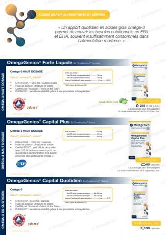 %u00ab Un apport quotidien en acides gras om%u00e9ga-3 permet de couvrir les besoins nutritionnels en EPA et DHA, souvent insuffisamment consomm%u00e9s dans l%u2019alimentation moderne. %u00bbACIDES GRAS POLYINSATUR%u00c9S ET D%u00c9RIV%u00c9S*%AR = Apport de R%u00e9f%u00e9rence (C.E.)Om%u00e9ga-3 HAUT DOSAGE C%u0153ur(1), cerveau(2), vision(2)%u2022EPA et DHA : 1250 mg / cuill%u00e8re %u00e0 caf%u00e9 %u2022Huile de poisson ultrapure et stable %u2022Certifi%u00e9 par l%u2019%u00e9colabel %u00abFriend of the Sea%u00a9%u00bb%u2022PUFANOX%u00ae : excellente stabilit%u00e9 gr%u00e2ce %u00e0 ses propri%u00e9t%u00e9s antioxydantesOM%u00c9GA-3 HAUT DOSAGEOmegaGenics%u00ae Forte Liquide Ex OmeNutrics%u00ae LiquideComposition par cuill%u00e8re %u00e0 caf%u00e9Acides gras om%u00e9ga-3 Dont EPA (acide eicosapenta%u00e9no%u00efque)750 mg Dont DHA (acide docosahexa%u00e9no%u00efque)500 mgVitamine E (ac%u00e9tate de D-alpha-tocoph%u00e9ryl)13 mg108 %*5 ml (1 c. %u00e0 c.) / jour210ml (42 c. %u00e0 c.)La posologie peut %u00eatre adapt%u00e9eLa dose maximale est de 5 ml 2 fois / jourGo%u00fbt citron vertOm%u00e9ga-3 HAUT DOSAGE C%u0153ur(3), cerveau(4), vision(4)%u2022EPA et DHA : 1000 mg / capsule%u2022Huile de poisson ultrapure et stable %u2022Certifi%u00e9 IFOSTM : test officiel de qualit%u00e9 avec 100 % de transparence pour ce qui est de la concentration et la puret%u00e9 prouv%u00e9es des acides gras om%u00e9ga-3OM%u00c9GA-3 HAUT DOSAGEOmegaGenics%u00ae Capital Plus Ex OmeNutrics%u00ae ForteComposition par capsuleHuile de poisson1250 mg Dont EPA (acide eicosapenta%u00e9no%u00efque)600 mg Dont DHA (acide docosahexa%u00e9no%u00efque)400 mg1capsule / jour60capsulesLa posologie peut %u00eatre adapt%u00e9eLa dose maximale est de 3 capsules / jour*%AR = Apport de R%u00e9f%u00e9rence (C.E.)Om%u00e9ga-3 C%u0153ur(5), cerveau(6), vision(6)%u2022EPA et DHA : 500 mg / capsule%u2022Huile de poisson ultrapure et stable %u2022Certifi%u00e9 par l%u2019%u00e9colabel %u00abFriend of the Sea%u00a9%u00bb%u2022PUFANOX%u00ae : excellente stabilit%u00e9 gr%u00e2ce %u00e0 ses propri%u00e9t%u00e9s antioxydantesOM%u00c9GA-3 DU QUOTIDIENOmegaGenics%u00ae Capital Quotidien Ex OmeNutrics%u00ae G%u00e9luleComposition par capsuleAcides gras om%u00e9ga-3 Dont EPA (acide eicosapenta%u00e9no%u00efque)...........Min. 300 mg Dont DHA (acide docosahexa%u00e9no%u00efque)..........Min. 200 mgVitamine E (ac%u00e9tate de D-alpha-tocoph%u00e9ryl)................3 mg............25 %*1 %u00e0 3capsule(s) / jour90capsules(1) EPA et DHA - (2) DHA(3) EPA et DHA - (4) DHA(5) EPA et DHA - (6) DHA%u00a9 Metagenics %u00a9 Metagenics %u00a9 Metagenics %u00a9 Metagenics %u00a9 Metagen%u00a9 Metagenics %u00a9 Metagenics %u00a9 Metagenics %u00a9 Metagenics %u00a9 Metacs%u00a9 Metagenics %u00a9 Metagenics %u00a9 Metagenics %u00a9 Mics%u00a9 Metagenics %u00a9 Metagenics ics%u00a9 Metagenics ics