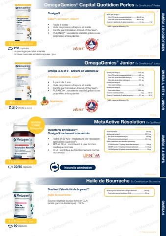 Acide gras om%u00e9ga-3 Dont EPA (acide eicosapenta%u00e9no%u00efque)Min 80 mg Dont DHA (acide docosahexa%u00e9no%u00efque)Min 50 mgVitamine E (ac%u00e9tate de D-alpha-tocoph%u00e9ryl)1,5 mg13 %**%AR = Apport de R%u00e9f%u00e9rence (C.E.)Composition par capsuleOm%u00e9ga-3C%u0153ur(7), cerveau(8), vision(8)%u2022Facile %u00e0 avaler%u2022Huile de poisson ultrapure et stable %u2022Certifi%u00e9 par l%u2019%u00e9colabel %u00abFriend of the Sea%u00a9%u00bb%u2022PUFANOX%u00ae : excellente stabilit%u00e9 gr%u00e2ce %u00e0 ses propri%u00e9t%u00e9s antioxydantesOM%u00c9GA-3 DU QUOTIDIENOmegaGenics%u00ae Capital Quotidien Perles Ex OmeNutrics%u00ae Perles1 %u00e0 3capsule(s) / jour250capsulesLa posologie peut %u00eatre adapt%u00e9eLa dose maximale est de 6 capsules / jourAcides gras om%u00e9ga-31155 mg Dont EPA (acide eicosapenta%u00e9no%u00efque)462 mg Dont DHA (acide docosahexa%u00e9no%u00efque)277 mg Dont ALA (acide alpha-linol%u00e9nique)231 mgAcides gras om%u00e9ga-6 Dont acide linol%u00e9%u00efque462 mgAcides gras om%u00e9ga-9 Dont acide ol%u00e9ique1663 mgVitamine D (chol%u00e9calcif%u00e9rol)5 %u00b5g100 %*Vitamine E (ac%u00e9tate de D-alpha-tocoph%u00e9ryl)6,7 mg56 %**%AR = Apport de R%u00e9f%u00e9rence (C.E.)Composition par cuill%u00e8re %u00e0 caf%u00e9Om%u00e9ga-3, 6 et 9 %u2013 Enrichi en vitamine DFonction c%u00e9r%u00e9brale, vision(9)%u2022%u00c0 partir de 3 ans%u2022Huile de poisson ultrapure et stable %u2022Certifi%u00e9 par l%u2019%u00e9colabel %u00abFriend of the Sea%u00a9%u00bb%u2022PUFANOX%u00ae : excellente stabilit%u00e9 gr%u00e2ce %u00e0 ses propri%u00e9t%u00e9s antioxydantesOM%u00c9GA-3, 6 ET 9 - JUNIOROmegaGenics%u00ae Junior Ex OmeNutrics%u00ae Junior5ml (1 c. %u00e0 c.) / jour210ml (42 c. %u00e0 c.)Huile de poisson500 mgAcides gras om%u00e9ga-3337,5 mg EPA (acide eicosapenta%u00e9no%u00efque)100 mg DHA (acide docosahexa%u00e9no%u00efque)162,5 mgSPM%u2019s (m%u00e9diateurs pro-r%u00e9solution sp%u00e9cialis%u00e9s) 17-HDHA (acide 17-hydroxy-docosahexa%u00e9no%u00efque)120 %u00b5g 18-HEPE (acide 18-hydroxy-eicosapenta%u00e9no%u00efque)112,5 %u00b5g 14-HDHA (acide 14-hydroxy-docosahexa%u00e9no%u00efque)55 %u00b5gComposition par capsuleInconforts physiques(10) Om%u00e9ga-3 hautement concentr%u00e9s %u2022Riche en SPM%u2019s : m%u00e9diateurs pro-r%u00e9solution sp%u00e9cialis%u00e9s (Lipinova%u00ae) %u2022EPA et DHA : contribuent %u00e0 une fonction cardiaque normale %u2022DHA : contribue au fonctionnement normal du cerveau OM%u00c9GA-3 & SPM%u2019SMetaActive R%u00e9solution Ex OptiResol1 %u00e0 3capsule(s) / jour30/60capsulesHuile de graine de bourrache (Borago officinalis L.)500 mg Dont acide gamma-linol%u00e9nique (GLA)90 mgComposition par capsuleSoutient l%u2019%u00e9lasticit%u00e9 de la peau(11)Huile de bourrache : Source v%u00e9g%u00e9tale la plus riche en GLA (acide gamma-linol%u00e9nique) : 18 %OM%u00c9GA-6Huile de Bourrache Ex OmeNutrics%u00ae Bourrache1 %u00e0 3capsule(s) / jour90capsules(7) EPA et DHA - (8) DHA(9) DHA(10) EPA et DHA(11) Huile de bourracheGo%u00fbt fruits Nouvelle g%u00e9n%u00e9rationNOUVEAUFORMAT30 capsules%u00a9 Metagenics %u00a9 Metagenics %u00a9 Metagenics %u00a9 Metagenics %u00a9 Metagen%u00a9 Metagenics %u00a9 Metagenics %u00a9 Metagenics %u00a9 Metagenics %u00a9 Metacs%u00a9 Metagenics %u00a9 Metagenics %u00a9 Metagenics %u00a9 Mics%u00a9 Metagenics %u00a9 Metagenics ics%u00a9 Metagenics ics