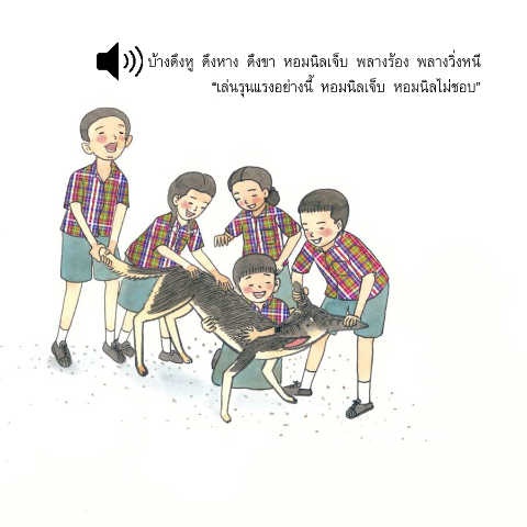 บ้างดึงหู ดึงหาง ดึงขา หอมนิลเจ็บ พลางร้อง พลางวิ่งหนี “เล่นรุนแรงอย่างนี้ หอมนิลเจ็บ หอมนิลไม่ชอบ”