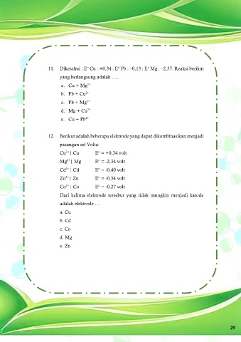 11. Diketahui : E Cu : +0,34 : E Pb : –0,13 : E Mg : –2,37. Reaksi berikut