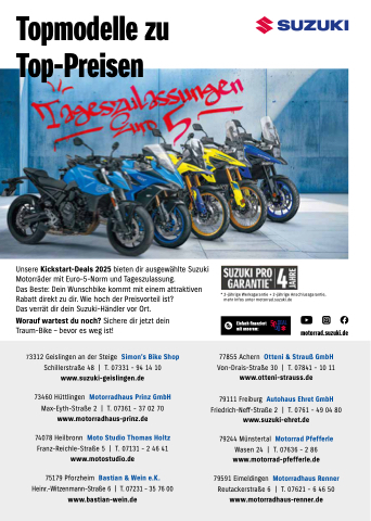 Das verrät dir dein Suzuki-Händler vor Ort.
