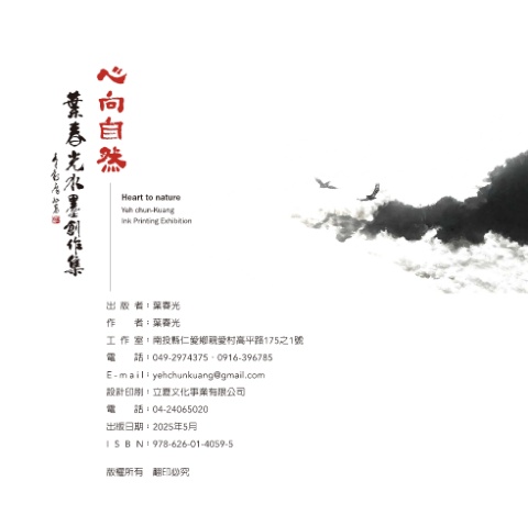 Heart to nature Yeh chun-Kuang Ink Printing Exhibition ̈و٫j݆Έ Ъ ٫ j݆Έ ʈЪ܃jیҳጤʠฌඊፋฌӀ৷̻༩175ʘ1 ཥ ༑ j049-2974375g0916-396785 E-mailjyehchunkuang@gmail.com ணࠇΙՏjͭࢀ˖ʷԫุϞࠢʮ̡ ཥ ༑ j04-24065020 ̈و˚ಂj2025ϋ5˜ ISBNj978-626-01-4059-5 وᛆהϞcᔕῚӺ