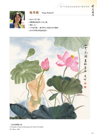 臺中市華夏書畫協會會員聯展專輯 楊秀娥 Yang, Hsiou-E یߕ 65 ֣ɝ፯f ყᖵஔึୋ 18 ֣ɝ፯f ࡈ࢝ɧϣf ʕശ˾ᜯ h ၽࣣɛيႦʿεϣᑌ࢝f ၽʕ̹ശࢀࣣึึࡰf ɓׂڀකຬছІί A thought of flowers blooming, all kinds of freedom 69Ò48cm 2024 108 109