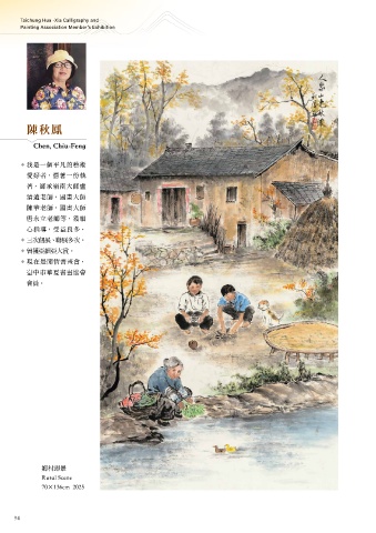 Taichung Hua -Xia Calligraphy and Painting Association Member's Exhibition 陳秋鳳 Chen, Chiu-Feng Ң݊ɓࡈ̻ɭٙᖵஔ ฌλ٫dኯഹɓ΅ੂ ഹdࢪוᏊیɽࢪጅ Ⴣϼࢪdɽࢪ ശϼࢪdɽࢪ ࡥ͑ͭϼࢪഃdᐏ ːܸኬdաूԄεf ɧϣࡈ࢝eᑌ࢝εϣf ಀᐏԭԭɽሧf ତί݊ඝઋࣣึd ၽʕ̹ശࢀࣣึ ึࡰf ඊӀу౻ Rural Scene 70Ò136cm 2025 94 95