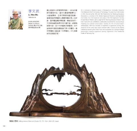 (H)04-24363385 委、臺中雕塑獎評審委員。個展近50次, held nearly 50 solo exhibitions, particularly renowned for woodcarvings