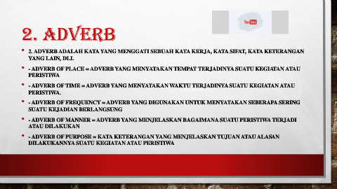 • 2. ADVERB ADALAH KATA YANG MENGGATI SEBUAH KATA KERJA, KATA SIFAT, KATA KETERANGAN