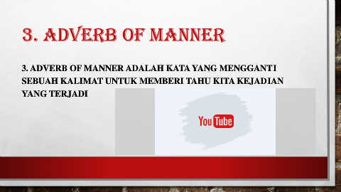 3. ADVERB OF MANNER 3. ADVERB OF MANNER ADALAH KATA YANG MENGGANTI SEBUAH KALIMAT UNTUK MEMBERI TAHU KITA KEJADIAN YANG TERJADI