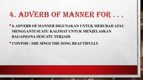 4. ADVERB OF MANNER FOR . . . • 4. ADVERB OF MANNER DIGUNAKAN UNTUK MERUBAH ATAU MENGGANTI SUATU KALIMAT UNTUK MENJELASKAN BAGAIMANA SESUATU TERJADI • CONTOH : SHE SINGS THE SONG BEAUTIFULLY