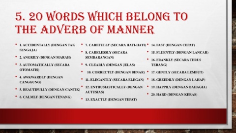 • 1. ACCIDENTALLY (DENGAN TAK • 7. CAREFULLY (SECARA HATI-HATI)• 14. FAST (DENGAN CEPAT)