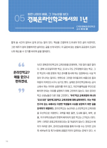 1181%ub144%uac04 %uacbd%ubd81%uc628%ub77c%uc778%ud559%uad50%uc758 %uad50%uc721%uacfc%uc815%uc744 %uc6b4%uc601%ud558%uba70, %uac00%uc7a5 %ub9ce%uc774 %ub4e4%uc740 %ub9d0%uc774%ub2e4. %uacbd%ubd81 %ub0b4 %uc720%uc77c%ubb34%uc774%ud55c %ud559%uad50, %ub3c4%ub0b4 %ub204%uad6c%ub3c4 %uadfc%ubb34%uacbd%ud5d8%uc774 %uc5c6%ub294 %ud559%uad50. %uadf8%ub7f0 %ud559%uad50%uc758 %uc2dc%ubc94 %uc6b4%uc601%uacfc %uac1c%uad50 %uc900%ube44%ub97c %ub3d9%uc2dc%uc5d0 %ud558%ub294 %uc785%uc7a5%uc5d0%uc11c%ub294 %uc0ac%uc2e4 %uc5b5%uc7a5%uc774 %ubb34%ub108%uc9c0%ub294 %ub9d0%uc774%ub2e4. %ud55c%ud3b8%uc73c%ub85c %uadf8%ub9cc%ud07c %uc544%uc774%ub4e4%uacfc%uc758 %uc528%ub984%uc73c%ub85c %ubab8%uacfc %ub9c8%uc74c%uc774 %uc9c0%uccd0%uc788%uc73c%uc2dc%uad6c%ub098 %uc2f6%uae30%ub3c4 %ud588%ub2e4. %uc2e4%uc81c%ub85c %uc628%ub77c%uc778%ud559%uad50%uc5d0%uc11c%ub294 %uae09%uc2dd%uc18c%uc5d0%uc11c %ub6f0%ub294 %uc544%uc774%uc640 %uc2e4%ub791%uc774%ub97c %ud558%uc9c0 %uc54a%uace0, %uc57c%uac04%uc790%uc728%ud559%uc2b5%uc744 %ubb34%ub2e8%uc73c%ub85c %ube60%uc9c0%uba74 %uc548%ub418%ub294 %uc774%uc720%ub97c %uc124%uba85%ud558%uae30 %uc704%ud574 %uace0%ubbfc%ud558%uc9c0 %uc54a%ub294%ub2e4. %ub300%uc2e0 %uc628%ub77c%uc778%ud559%uad50 %uc120%uc0dd%ub2d8%ub4e4%uc740 %ub2e4%ub978 %uac83%uc744 %uace0%ubbfc%ud55c%ub2e4. %u2018%uc6b0%ub9ac%u2019%ud559%uad50 %uad50%uc721%uacfc%uc815%uc774 %uc544%ub2c8%ub77c %u2018%ub3c4%ub0b4 %ubaa8%ub4e0%u2019 %uc77c%ubc18%uacc4%uace0%ub4f1%ud559%uad50 %uad50%uc721%uacfc%uc815%uc5d0 %ub300%ud574 %uc0b4%ud3b4%uc57c%ud55c%ub2e4. %uc774%ub294 %ud559%ub839%uc778%uad6c%uc758 %uac10%uc18c %uc18d%uc5d0%uc11c%ub3c4 %ub2e4%uc591%ud55c %ud559%uc0dd%ub4e4%uc758 %uc218%uc694%ub97c %ubcf4%uc7a5%ud558%uae30 %uc704%ud55c %uae38%uc744 %ubaa8%uc0c9%ud558%uae30 %uc704%ud568%uc774%ub2e4. %uc628%ub77c%uc778%ud559%uad50%ub294 %ub18d%uc0b0%uc5b4%ucd0c %uc18c%uaddc%ubaa8%ud559%uad50%uc758 %uad50%uc721%uacfc%uc815%uc744 %uc6b0%uc120%uc801%uc73c%ub85c %uc9c0%uc6d0%ud55c%ub2e4. %uacfc%ud559%uc744 %uc608%ub85c %ub4e4%uba74, %ub3c4%ub0b4%uc5d0 %ubb3c%ub9ac, %ud654%ud559, %uc0dd%ubb3c, %uc9c0%uad6c%uacfc%ud559%uc120%uc0dd%ub2d8%uc774 %ud55c%uba85%uc529 %ubc30%uce58%ub418%uc9c0 %uc54a%uc740 %ud559%uad50%ub294 27%uac1c%uad50%ub098 %ub41c%ub2e4. %uacfc%ud559%u2160%uacfc%ubaa9%uc740 %uacf5%ub3d9%uad50%uc721%uacfc%uc815%uc73c%ub85c%ub294 %uc798 %uac1c%uc124%ub418%uc9c0 %uc54a%ub294%ub2e4. %uacb8%uc784%uad50%uc0ac %ubc30%uce58%uac00 %uc5b4%ub824%uc6b4 %uacbd%uc6b0, %uc628%ub77c%uc778%ubcf4%ucda9%uacfc%uc815%uc744 %ud1b5%ud574 %uc774%uc218%ud560 %uc218%ub294 %uc788%uc9c0%ub9cc %uad50%uacfc%ubaa9 %uc138%ubd80%ub2a5%ub825 %ubc0f %ud2b9%uae30%uc0ac%ud56d%uc5d0 %uacf5%ud1b5%ubb38%uad6c%ub9cc%uc774 %uc785%ub825%ub418%ub294 %ubb38%uc81c%uac00 %uc788%ub2e4. %uc0ac%ud654%uba74 %ub108%uba38%uc758 %ubc30%uc6c0, %uadf8 %uac00%ub2a5%uc131%uc744 %ubcf4%ub2e4; 05 %uacbd%ubd81%uc628%ub77c%uc778%ud559%uad50%uc5d0%uc11c%uc758 1%ub144(%uac00%uce6d)%uacbd%ubd81%uc628%ub77c%uc778%ud559%uad50 %uad50%uc0ac %uc774 %ub2e4 %uacb8%u201c %u201d%uc628%ub77c%uc778%ud559%uad50?%uc560%ub4e4 %uc5c6%uc73c%ub2c8 %ud3b8%ud558%uaca0%ub124.%uc9e7%uac8c %uc4f8 %uc2dc%uac04%uc774 %uc5c6%uc5b4%uc11c %uae38%uac8c %uc4f4%ub2e4%ub294 %ub9d0%uc774 %uc788%ub2e4. %ud575%uc2ec%uc744 %uac04%uacb0%ud558%uac8c %ub4dc%ub7ec%ub0b4%uc57c %uba4b%uc9c4 %uae00%uc774 %ub418%uaca0%uc9c0%ub9cc, %uadf8%ub7f0 %uc7ac%uc8fc%uac00 %uc5c6%uc5b4 %uc7a5%ud669%ud558%uc9c0%ub9cc %uc0b4%uc544%uc788%ub294 %uae00%uc744 %uc4f0%uac8c %ub418%uc5c8%ub2e4. %uc774 %uae00%ub85c%uc368 %uc77d%ub294 %ubd84%ub4e4%uc758 %uad81%uae08%uc99d%uc774 %uc870%uae08%uc774%ub098%ub9c8 %ud574%uc18c%ub420 %uc218 %uc788%uae30%ub97c %ubc14%ub77c%uba70 %uae00%uc744 %uc5f4%uc5b4%ubcf8%ub2e4.