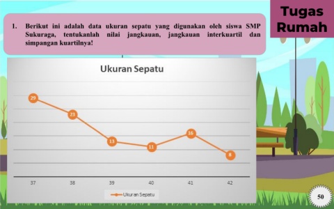 Tugas Rumah 1. Berikut ini adalah data ukuran sepatu yang digunakan oleh siswa SMP Sukuraga, tentukanlah nilai jangkauan, jangkauan interkuartil dan simpangan kuartilnya! 50