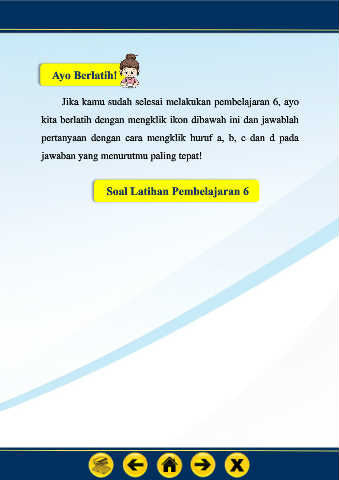 Ayo Berlatih! Jika kamu sudah selesai melakukan pembelajaran 6, ayo kita berlatih dengan mengklik ikon dibawah ini dan jawablah pertanyaan dengan cara mengklik huruf a, b, c dan d pada jawaban yang menurutmu paling tepat! Soal Latihan Pembelajaran 6