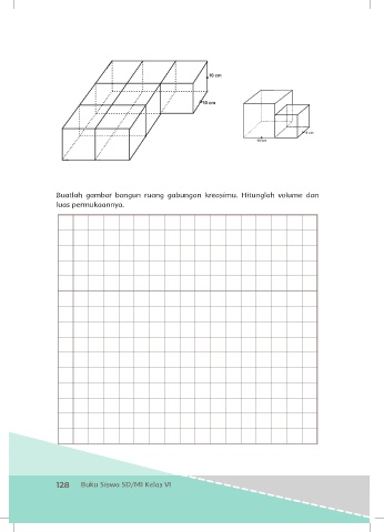 Buatlah gambar bangun ruang gabungan kreasimu. Hitunglah volume dan luas permukaannya. 128 Buku Siswa SD/MI Kelas VI