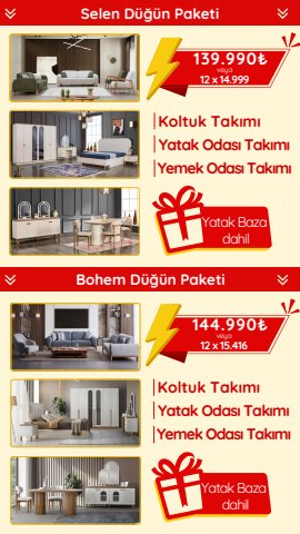 Selen D%u00fc%u011f%u00fcn Paket Bohem D%u00fc%u011f%u00fcn Paket Yatak Odas%u0131 Tak%u0131m%u0131Koltuk Tak%u0131m%u0131YemekOdas%u0131Tak%u0131m%u0131139.990%u20baYatakBazadah l12 x 14.999veyaYatak Odas%u0131 Tak%u0131m%u0131Koltuk Tak%u0131m%u0131YemekOdas%u0131Tak%u0131m%u0131144.990%u20baYatakBazadah l12 x 15.416veya